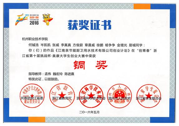 由共青团浙江省委、浙江省教育厅、浙江省科学技术协会、温州市人民政府、浙江省学生联合会主办的“创青春”浙江省第十届“挑战杯”大学生创业大赛近日落下帷幕。经校内评审推荐、省级复赛及现场决赛环节,由友嘉机点学院孟伟、魏宏玲、陈进熹指导,何铖浩、岑凯凯、张威、李真真、方俊蔚、章晨威、徐鹏、杨争争、金增光、易城共同申报的《江南泉节能厨卫用水技术有限公司创业计划》作品获铜奖。