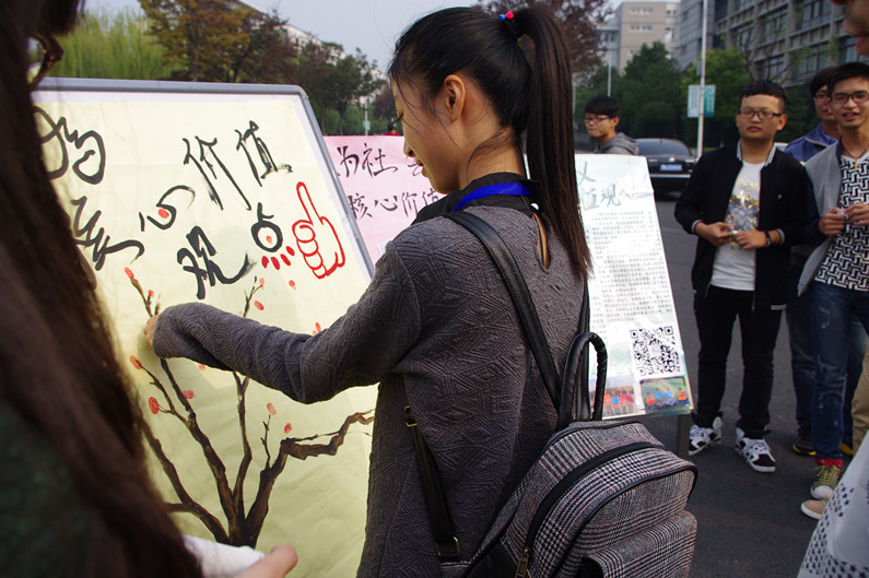 近日,校学生会组织的“我为社会主义核心价值观点赞”的主题宣传活动在校园善湖边拉开序幕,向全校同学弘扬核心价值观——“富强、民主、文明、和谐,自由、平等、公正、法治,爱国、敬业、诚信、友善”这24字的基本内容。