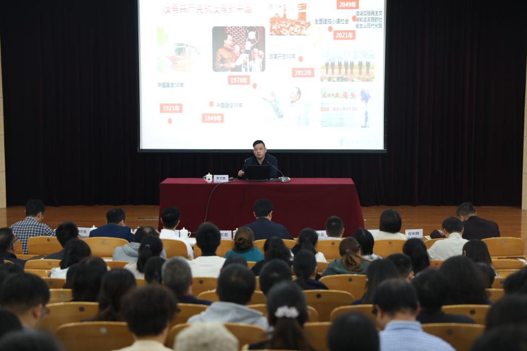 11月6日下午,“不忘初心、牢记使命”主题教育专题党课在行政楼二楼报告厅召开。本次党课由校党委副书记、校长贾文胜主讲,学校党政领导班子成员、全体处级干部、全体教工党员以及部分学生党员代表参加。专题党课由党委委员、组织部长麻朝晖主持。