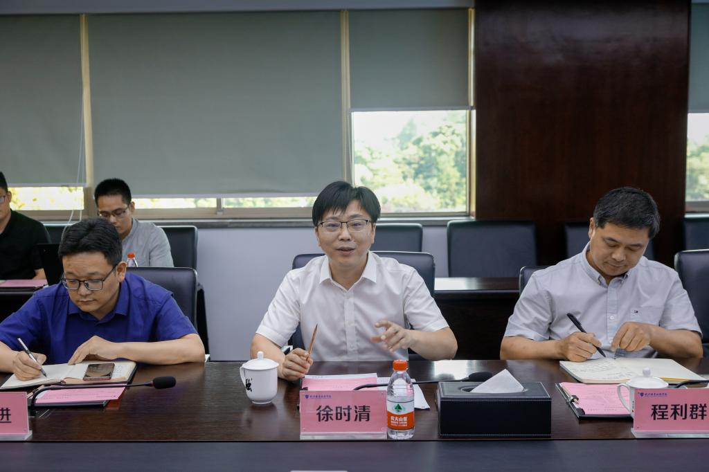 徐时清对陈达一行到校调研表示热烈欢迎,并简要汇报了学校科技成果转化工作进展以及应用技术社会服务推广的有关情况。他指出,近年来,学校高度重视科研成果工作,通过整合校内外优质资源、开拓平台,在全省高职院校中率先打响了科技成果杭职拍品牌。他表示,学校下一步将在省教育厅和上级有关部门的指导下,深化健全校企共同体为基础的成果转化机制,优化科技成果转化流程,进一步激发广大一线教师的创新活力,持续打造好科技成果转化“杭职拍”品牌,增强示范和引领效用。