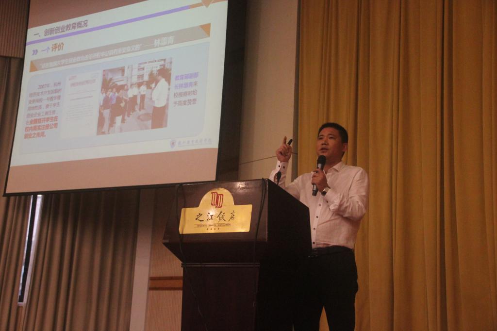 在25日下午的高职分论坛上,陈加明应邀作题为《杭州职业技术学院“3334”创新创业教育模式构建与实践》的案例分享。他总结了近年来我校坚持以“创业带动学业,提升就业能力”为引领,践行“规划成长,兴趣为本”“能力提升,创新为要”“创业发展,实战为上”三大理念,整合政府创新创业政策、创业教育机构和合作企业三类资源,培育生涯规划导师、专业创新导师和创业指导教师三支队伍,完善“通识教育+创新教育+专门教育+创业实践”的四阶段体系,探索形成了“3334”创新创业教育模式,促进了创新创业教育与专业教育的有机融合,有效提升了人才培养质量,促进了学生体面就业。我校深化创新创业教育改革的特色与成效获得了与会领导与代表的好评。