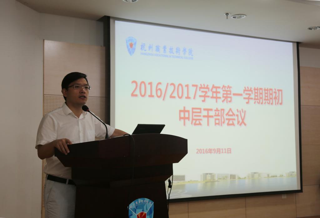 贾文胜从捷报频传、喜事不断,服务G20、平稳有序,内涵发展、扎实推进,奉献付出、无声无息等四个方面,回顾了学校暑期工作情况。随后,他着重传达了省委教育工委书记、教育厅厅长刘希平在8月份高职院校书记校长读书会上所作的关于“校园文化建设”的讲话精神,指出高职院校要注意加强思想政治建设、培养“工匠”精神、开展校园文化环境建设、用心建设教师队伍。他表示,作为杭职人需要明确了解杭职的“新常态”,正确地处理好“新使命”与“新征程”、“新机遇”与“新挑战”、“新活力”与“新动力”、“新斗志”与“新状态”之间的关系。
