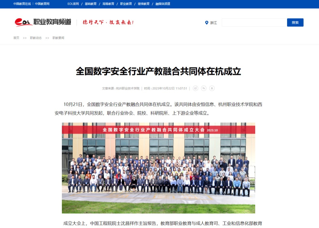 10月21日,全国数字安全行业产教融合共同体在杭成立,我校与安恒信息、西安电子科技大学为共同发起单位。随后中国教育在线、中国教育网、浙江在线、杭州教育发布、凤凰网、搜狐网、华龙网等多家媒体进行报道,对数字安全行业产教融合给予充分关注。