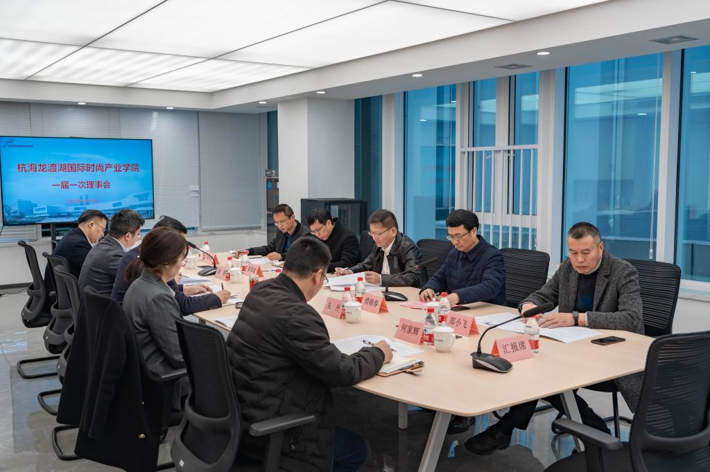 12月15日,杭海龙渡湖国际时尚产业学院一届一次理事会在数字新城双创中心召开。杭州职业技术学院党委书记陈文岳,副校长楼晓春,教务处、达利女装学院负责人参加会议。许村镇党委书记王枫铭,海宁市职业高级中学校长朱晓明,海宁市家用纺织品行业协会会长曹咬强等出席。会议由楼晓春主持。