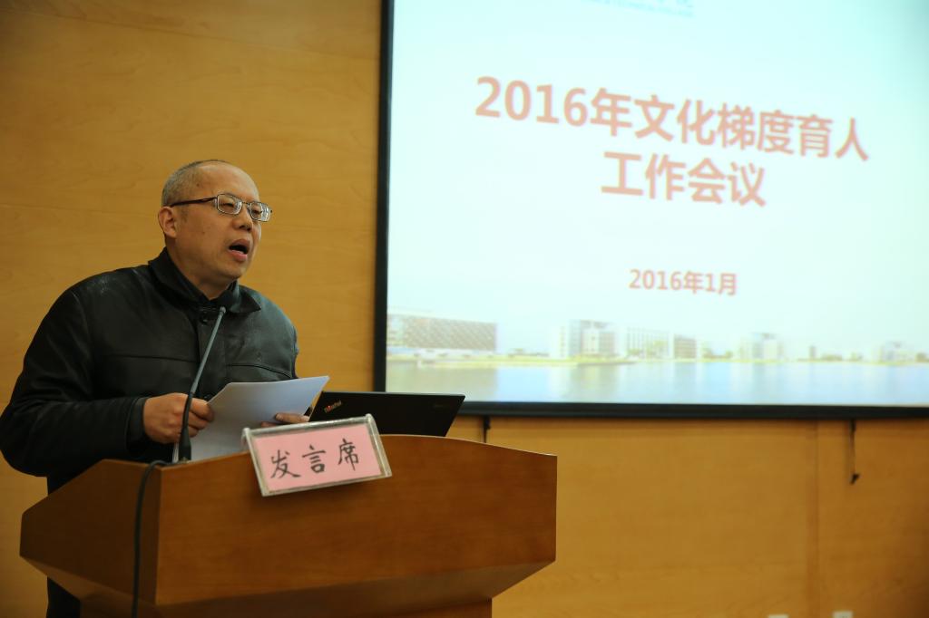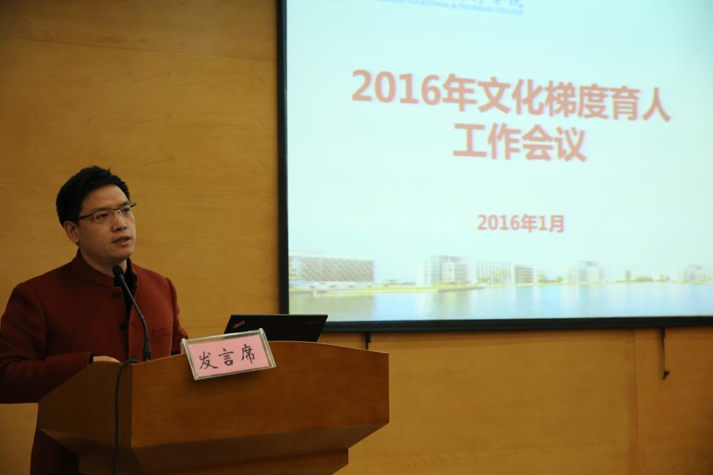 会上,校长贾文胜对2016年文化梯度育人工作进行了布置。他要求全体人员提高文化自信、发挥后发优势,重点要抓好国家职业院校文化素质教育基地建设和人文素质教育研究会2016年会两大工作;要围绕职业素养教育、学生素养养成教育、公民素养提升教育,突出工作重点,重在质量提升;要抓住发展机遇,管理骨干带头,率先文化育人。