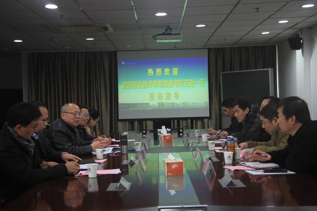 12月15日上午,安庆职业技术学院党委书记王进一行来访我校。党委书记安蓉泉、纪委书记陈泉淼,以及党政办、人事处、后勤保障处等相关部门负责人参与接待。