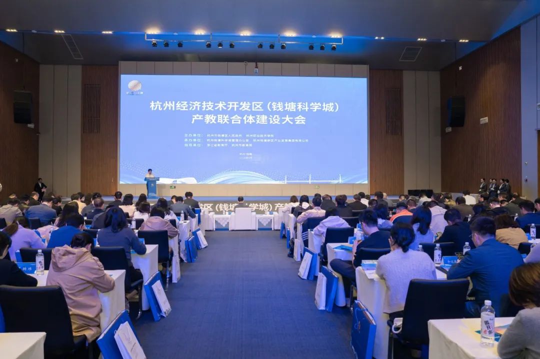 3月29日下午,杭州经济开发区(钱塘科学城)产教联合体建设大会在钱塘区国际创博中心隆重召开,浙江省教育厅职成教处处长陈达,杭州市委教育工委专职副书记、市教育局党组副书记陈萍,钱塘新区党工委委员、区委常委周妙荣,钱塘区人大常委会副主任李红,我校校长徐时清,科学城管理办公室党工委副书记、常务副主任谢国锋,钱塘区产业集团党委副书记、董事、总经理苏凡等钱塘区政府相关职能部门领导、联合体内高校、科研机构、企业代表100余人参加会议,会议由我校副校长楼晓春主持。