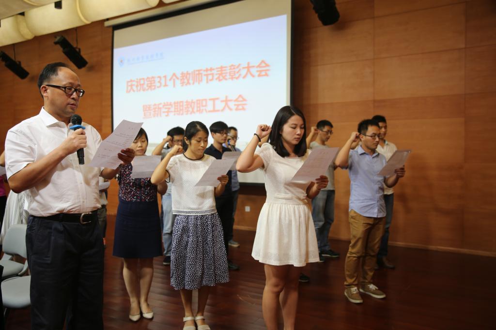 副校长许淑燕主持表彰大会。副校长张洪宪宣读市、校两级优秀教师、教育工作者和师德先进个人名单,校领导为获奖人员进行现场表彰。随后,在省级优秀教师吴晓苏的带领和全体教职员工的见证下,16位新入职教师举行了隆重的宣誓仪式,并在《高等学校教师师德承诺书》上郑重地签上了自己的承诺。教师代表李新辉等四位教师先后发言,他们用朴实的语言、真挚的情感和感人的事迹诠释了对教师岗位的热爱。