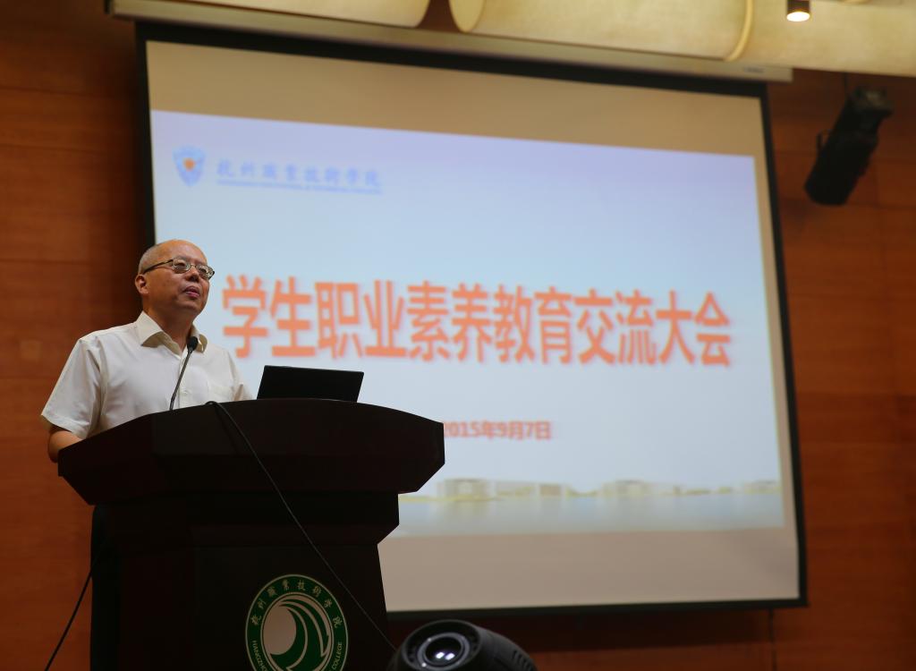会议首先由党委书记安蓉泉发言。他回顾了今年初学生职业素养教育“三个一”工作启动以来的的总体情况,指出为了解决高校文化育人工作上的短板,校党委去年提出了“文化梯度育人”的理念:一是分析教育对象的多重社会角色,把思想文化教育的内容分为“学生素养、职业素养和公民素养”三个梯度,分层施教、分段推进;二是把技能教育联系直接的职业素养教育分为“职业价值观、公共职业素养和专业职业素养”三个梯度,分类研究,分步提升;三是把思想文化教育的行为载体分为“课堂教学、课外活动和社会实践”三个梯度,分地布局,分序提高;四是在校园文化的建设过程中,将实施主体分为“学校设计为先、二级学院为主、专业教师为重和学生行为为本”四个梯度,分担职责,合理推进。