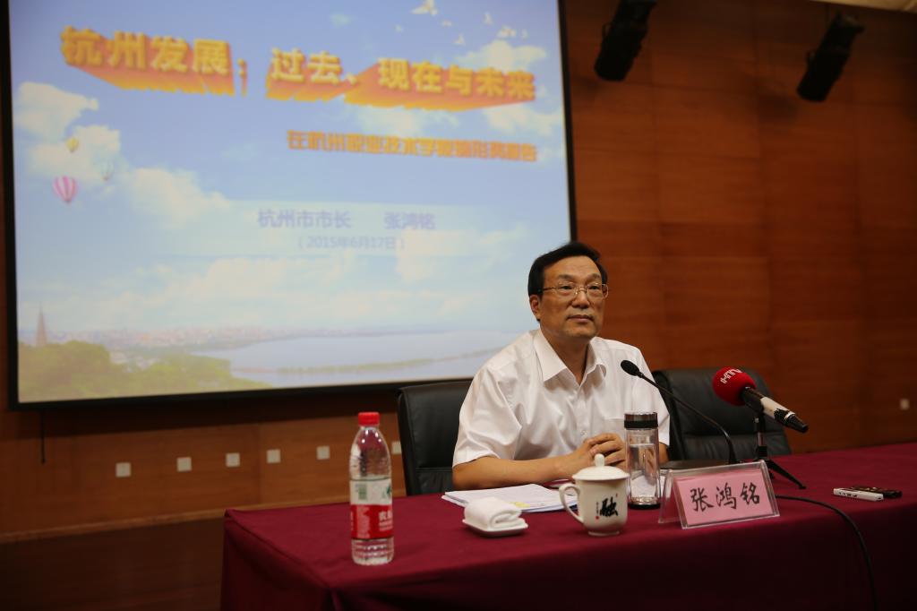 两个多小时的报告中,张鸿铭结合学习贯彻习近平总书记关于“三严三实”重要论述、中央“四个全面”战略布局和落实省、市决策部署,以及杭州经济社会发展面临的新形势、新问题,以“杭州发展的过去·现在·未来”为主题,与我校广大师生进行了交流。