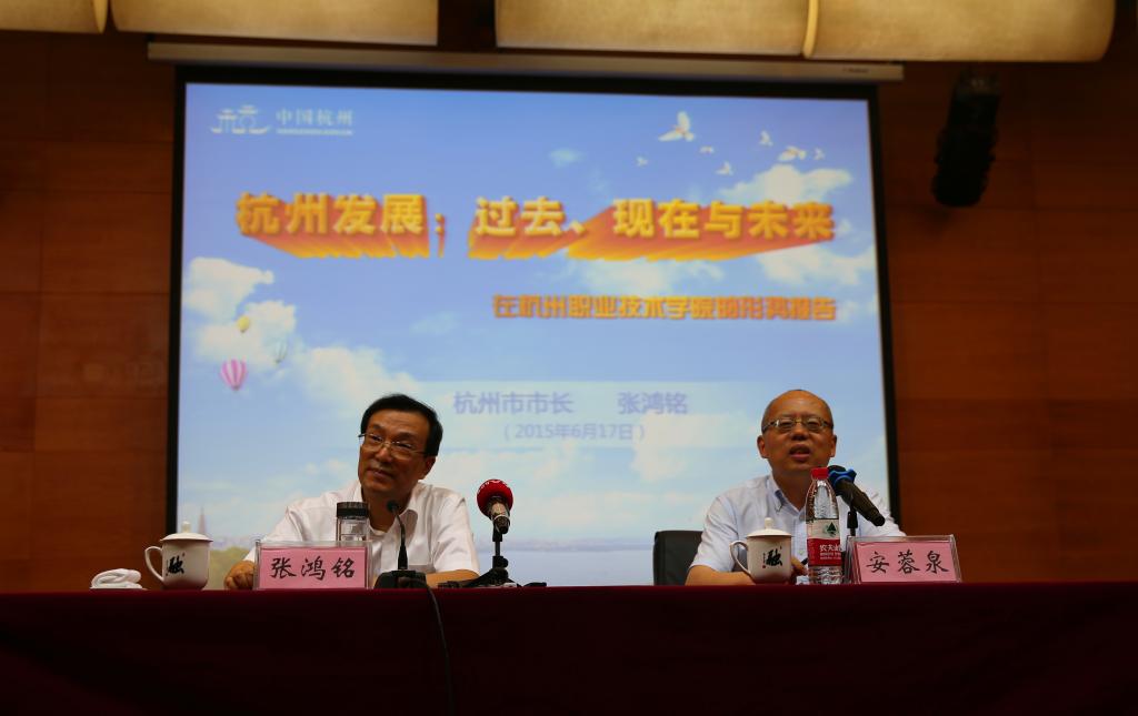 6月17日下午,杭州市市长张鸿铭来我校为广大师生上了一堂精彩的形势教育课。随同参加形势教育课的还有市政府秘书长王宏,市政府研究室主任何利松、市政府办公厅副主任鲍一飞以及市府办综合一处、市政府研究室有关处室负责人等。主会场设在图书馆报告厅,我校党政领导班子成员安蓉泉、赵一文、张洪宪、孙爱国、金徐伟,以及二级学院学生代表、党总支书记、团总支书记、辅导员、班主任等800余人在现场听取报告;分会场设在行政楼报告厅,全校处级干部及教职工代表400余人通过实时转播听取报告。报告会由我校党委书记安蓉泉主持。