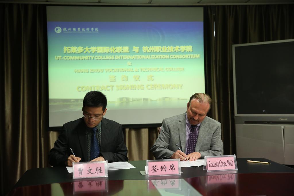 最后,贾文胜和Ronald Opp就国际化合作办学共同签署了协议。我校与托莱多大学-社区大学国际化联盟合作关系的确立,进一步深化和拓展了我校国际合作的新思路,对我校国际化发展必将起到重要推动作用。