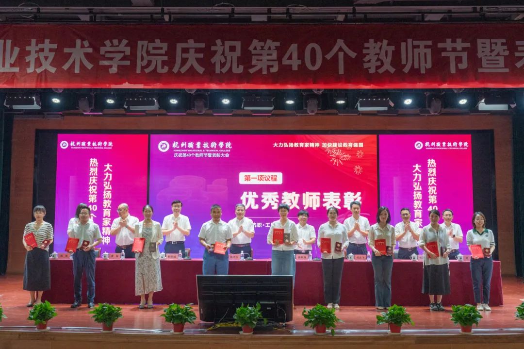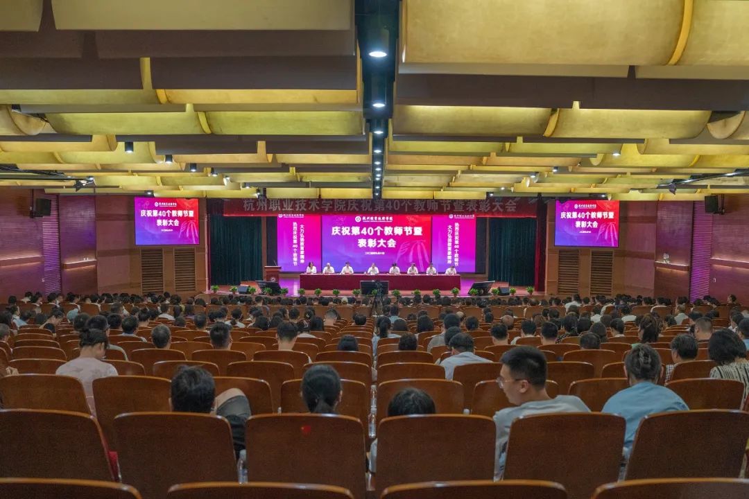 在深入学习贯彻党的二十届三中全会精神,认真落实习近平总书记在全国教育大会上的重要讲话精神之际,9月10日下午,杭州职业技术学院隆重举行题为“大力弘扬教育家精神,加快建设教育强国”的第40个教师节庆祝暨表彰大会,表彰一批师德高尚、业务精湛、默默耕耘、无私奉献的优秀教师和优秀教育工作者,分析学校当前发展面临的形势,谋划部署下阶段重点工作任务。校党委书记陈文岳,校长徐时清等校领导班子成员出席会议,并共同为受表彰者颁奖。全体教职员工齐聚一堂,共享这份荣耀与喜悦。会议由校党委副书记赖明诚主持。