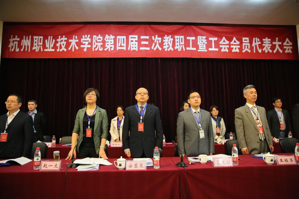 4月24日,杭州职业技术学院第四届教职工暨工会会员代表大会第三次会议在行政楼报告厅举行。我校党委班子成员安蓉泉、贾文胜、赵一文、张洪宪、许淑燕、陈泉淼、陈加明、孙爱国、金徐伟出席会议,“双代会”代表、特邀代表、列席代表参加了会议,听取并审议了校长工作报告、工会工作报告、提案工作报告;审议了工会经费审查工作报告、《杭州职业技术学院章程》(听取意见稿);听取了《学校党政领导班子关于教职工意见建议的整改情况反馈》;顺利完成了第四届工会委员会委员替补工作。