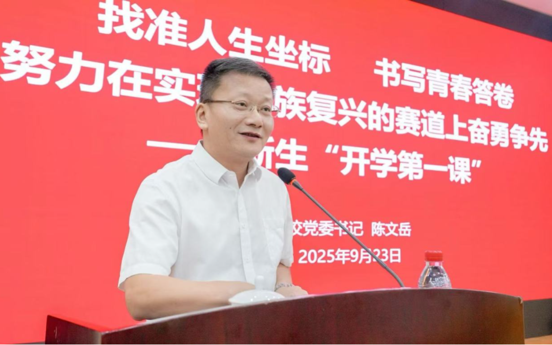 9月23日下午,校党委书记陈文岳以“找准人生坐标 书写青春答卷 努力在实现民族复兴的赛道上奋勇争先”为题,在行政楼二楼报告厅为2025级新生们讲授了“开学第一课”。