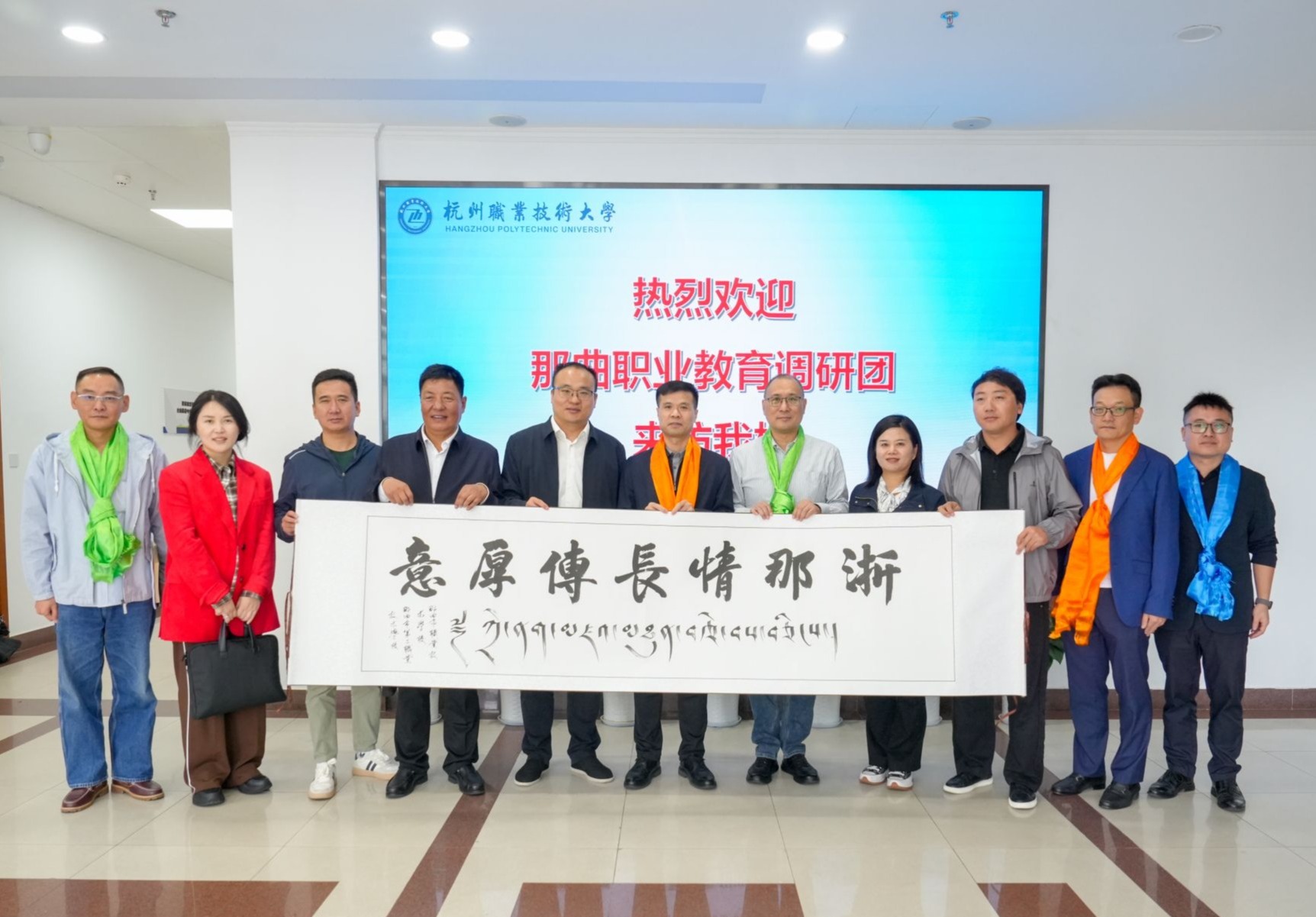 廖波对学校的热情接待表示感谢。他认为,杭州职业技术大学紧扣杭州区域产业发展脉动深化自身建设,树立了职业院校服务地方经济社会的优秀典范,是那曲市职业院校重点学习的标杆目标,希望调研团成员认真总结学习调研交流成果。他指出,那曲是我国海拔最高的地级市,在国家战略、生态安全、边疆稳定、民族发展等多重维度具有重要地位。近年来,浙江省援藏工作成效显著,那曲基础设施、产业发展、文化教育、医疗卫生等发生了翻天覆地的变化。廖波指出,教育是浙江援藏工作的重中之重,期待杭职大能进一步加强与那曲市职业院校的交流互动,以优质职教资源精准帮扶,深化产教融合模式输出,在促进民族团结、服务国家战略中做出应有的贡献。
