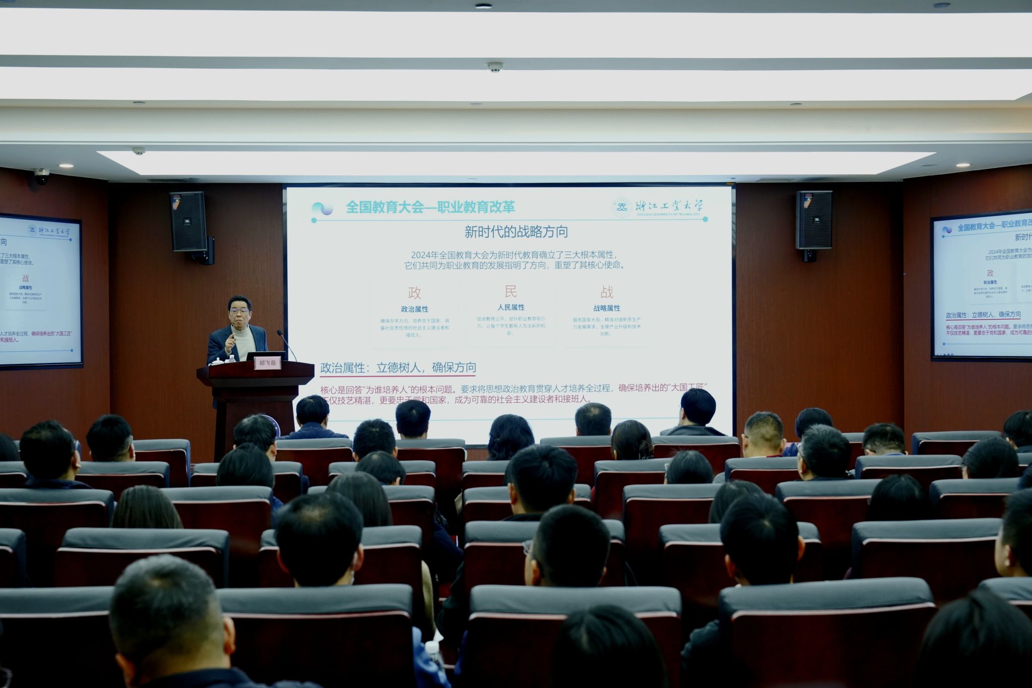 1月15日下午,学校召开学习贯彻党的二十届四中全会精神干部轮训专题报告会。会议特邀浙江工业大学职业技术教育学院原院长、二级教授、全国教育专业学位研究生教育指导委员会职业教育领域专家工作小组副组长邱飞岳来校作专题辅导报告。校领导班子成员、全体中层干部及第二期“菁英计划”人员参加,会议由校党委组织部部长韩亮主持。