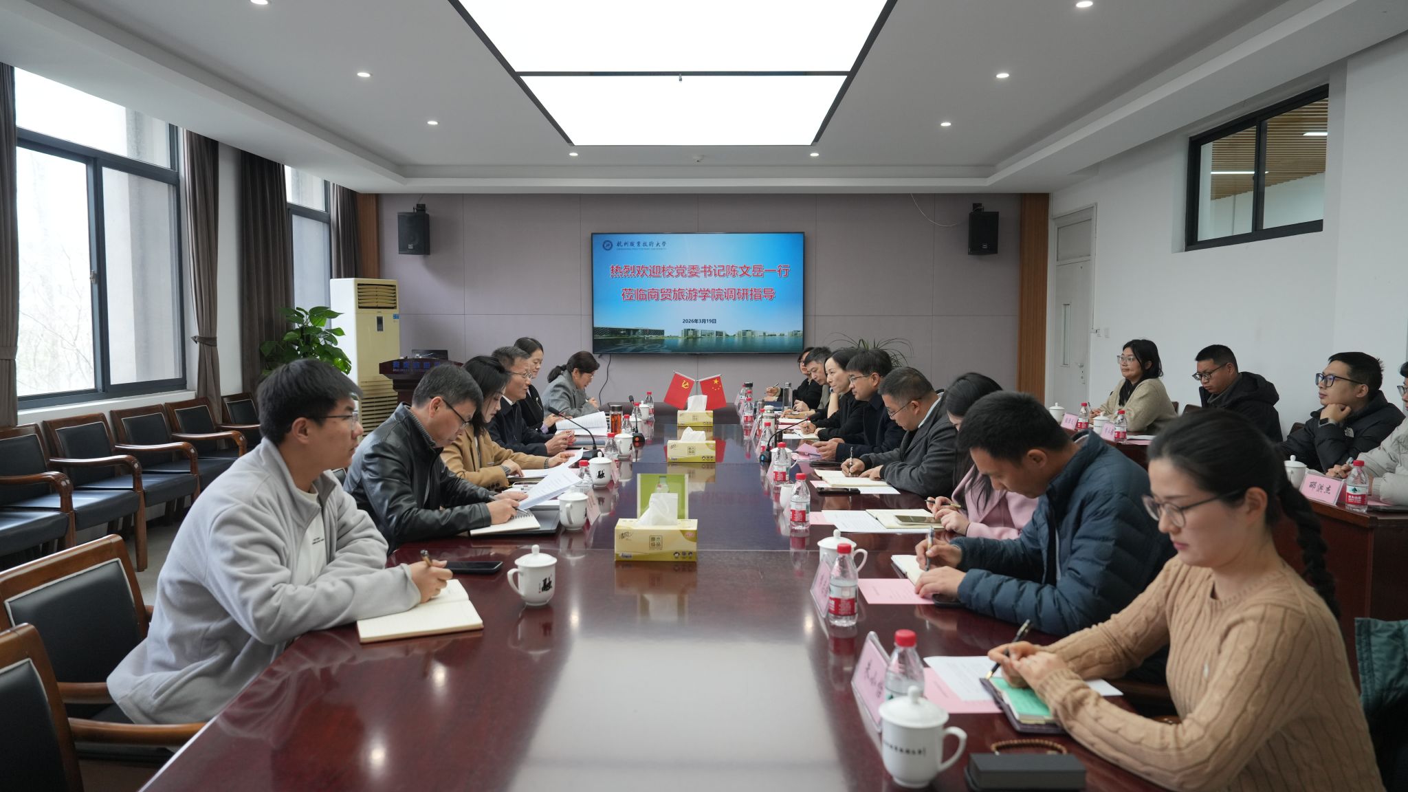 为扎实推进新校区开学各项筹备工作,凝聚发展共识,3月19日下午,校党委书记陈文岳带队赴商贸旅游学院开展专题调研。校党委委员、纪委书记沈阳红,办公室、人事处、教务处负责人陪同调研。商贸旅游学院班子成员、三办负责人、专业负责人及教师代表参加座谈。