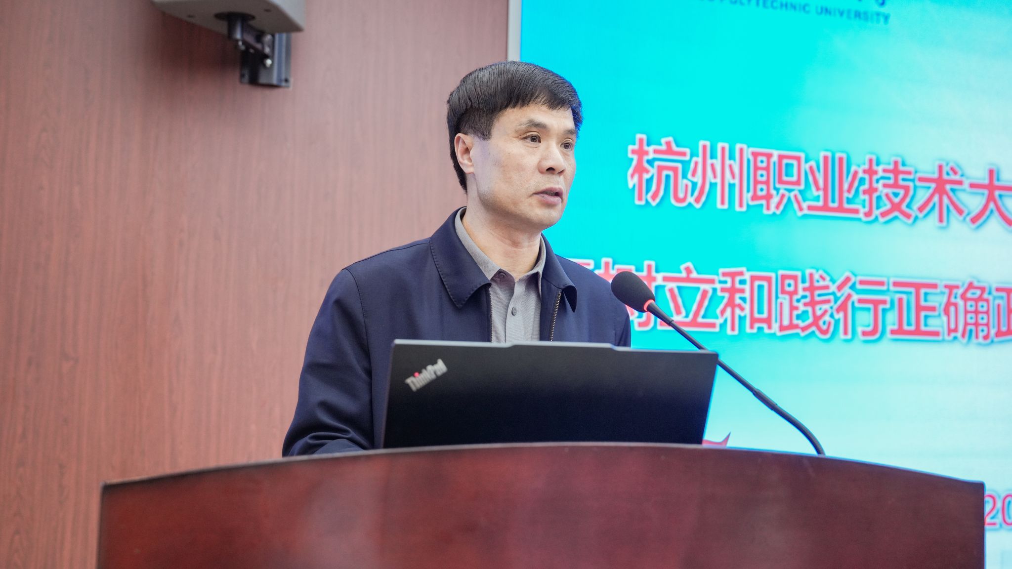 陈文岳结合习近平总书记关于树立和践行正确政绩观的重要论述分享了学习体会,强调开展专题学习教育,就是要思考并回答好为谁创造业绩、创造什么样的业绩、怎样创造业绩的根本问题。他指出,正确政绩观就是要牢固树立为人民谋利益的根本宗旨,一切为了学校发展,一切为了师生利益。要坚持党建统领全局,推动树立和践行正确政绩观学习教育取得扎实成效:一是从政治上准确把握,深刻认识正确政绩观的根本要求;二是从问题上深刻检视,清醒看到政绩观偏差的现实表现;三是从发展上精确校准,明晰职业本科建设的实践路径。