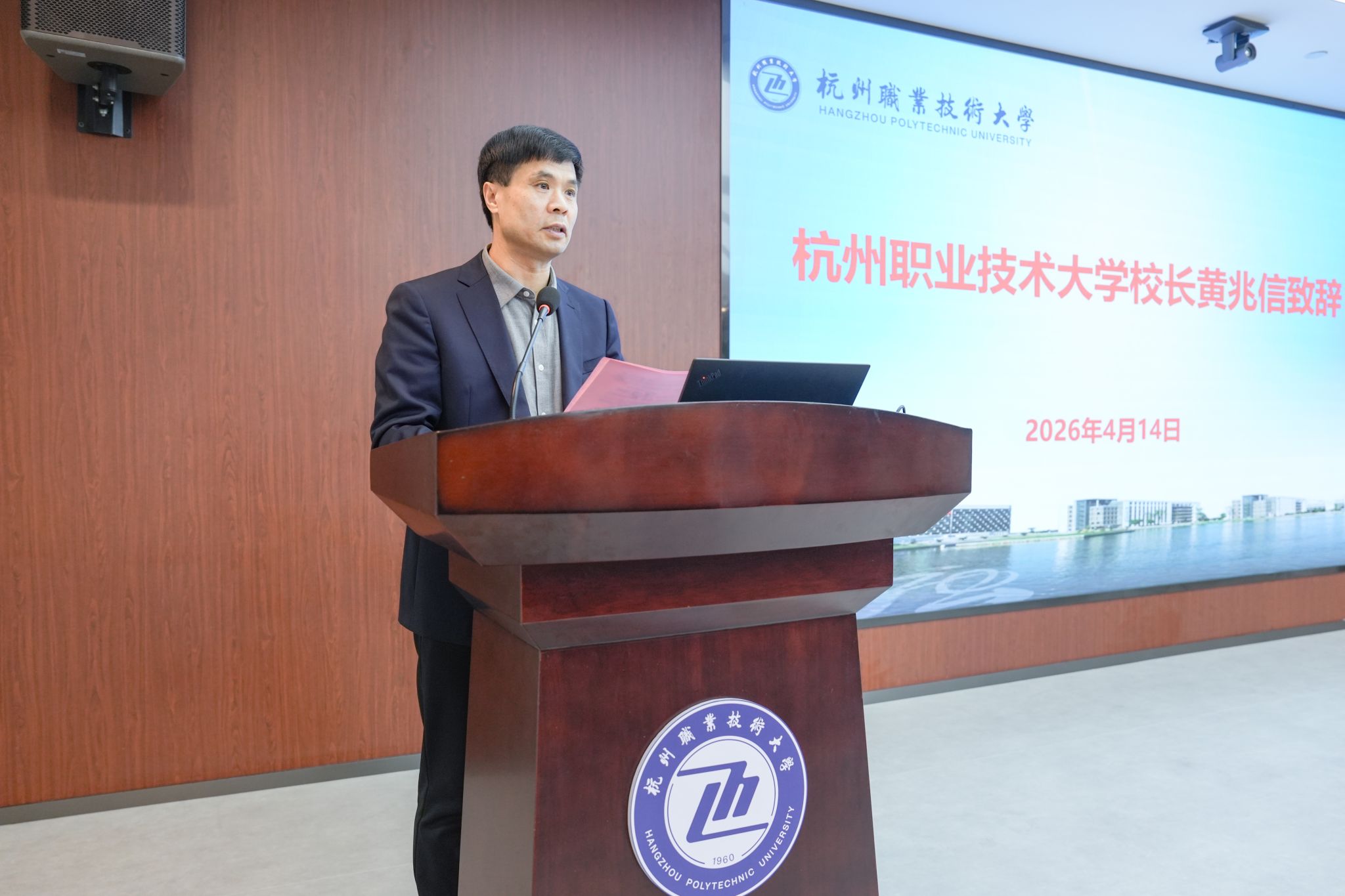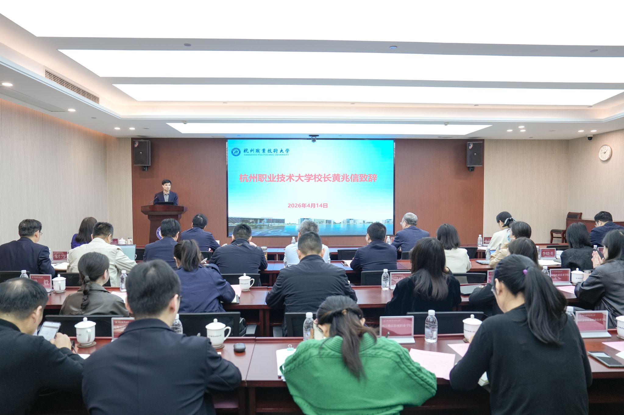4月14日,由浙江省教育考试院主办、杭州职业技术大学承办的浙江省高等职业学校办学能力评价工作总结交流(2025年度)暨2026年参评学校工作部署会在我校召开。省教育厅二级巡视员、督导处处长方红峰,省教育厅督导处二级调研员高迎春,省教育考试院研究室副主任林瑞玉,省教育考试院职教评估所所长叶清清,教育部高等职业评价专委会委员、浙江纺织服装职业技术学院校长郑卫东和教育部高等职业评价专委会委员、浙江建设职业技术学院原校长何辉等有关专家和参评学校领导共50余人参会。校长黄兆信出席会议并致辞。