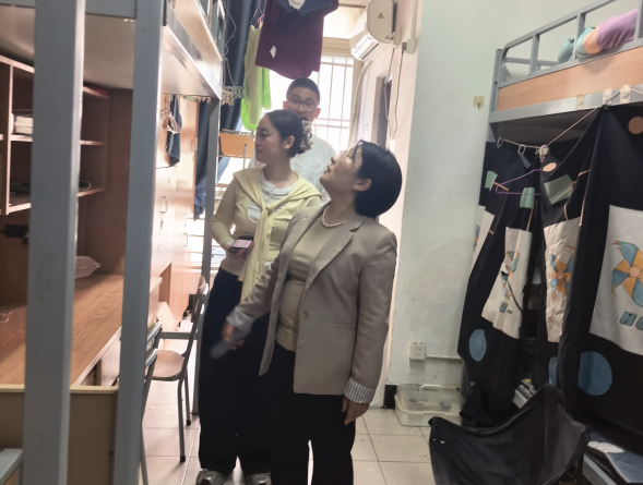 走访过程中,邓劲莲仔细检查了寝室的卫生状况,重点关注同学们的生活习惯、寝室公约执行情况及学习状态。她叮嘱同学们要自觉维护整洁有序的居住环境,营造互促共进的学习风气,把寝室建设成为涵养品格、锤炼作风的重要阵地。
