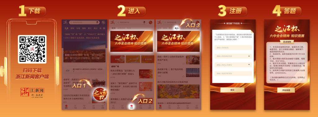 手机下载登录浙江新闻客户端(官方指定唯一参赛平台),点击头条浮窗、“活动”按钮或“观点”频道即可找到相应专题参与答题,首次答题请按照提示完成个人实名注册,我校师生单位性质选择“选择设区市党政机关-杭州市-市属单位模块”模块。具体操作示意图如下: