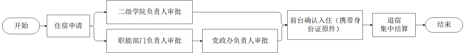 2.线下审批。具体操作如下:需求部门自行填写《接待中心客房使用申请表》(表单见附件),职能部门的申请由部门负责人审批签字后交党政办审批,审批同意后,将申请单交至接待中心;二级分院的申请由分院负责人审批签字,将申请单交至接待中心。