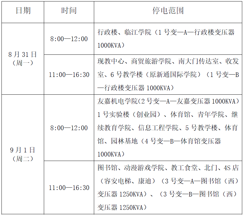 因学校图书馆、1、2、3、4号变压器检修,需作停电处理,具体安排如下:
