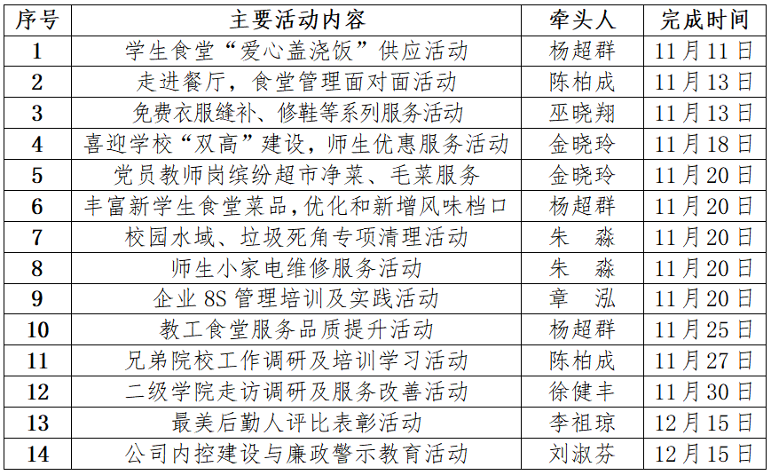 1.贴近服务。要深入扎实地开展服务师生活动,各项目业务主管牵头,分别开展食堂品质提升、公寓贴心服务、维修与保洁规范服务等活动,创造条件力争把师生关心的焦点难点问题进行梳理并在学校资金允许情况下逐步解决。