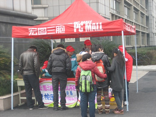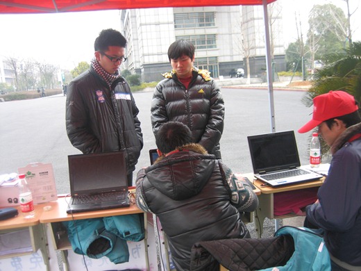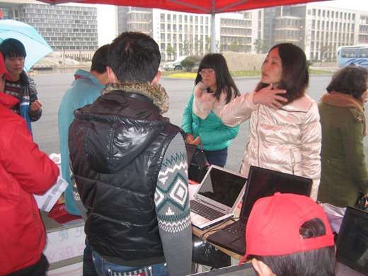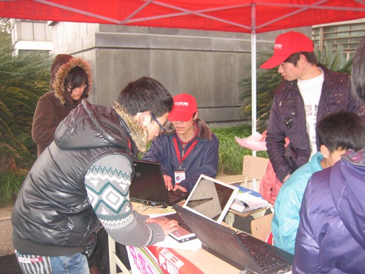 2月29日(星期三),10:00-16:00按计划《举办电脑维护服务》活动如期在现教楼东门进行,由浙江宏图三胞技术人员为我校师生义务提供电脑维护,咨询等服务活动。天虽然下着小雨,人数不怎么多(20人左右),技术人员认真维护,有问必答,耐心解释,但也得到了来者师生的认可。