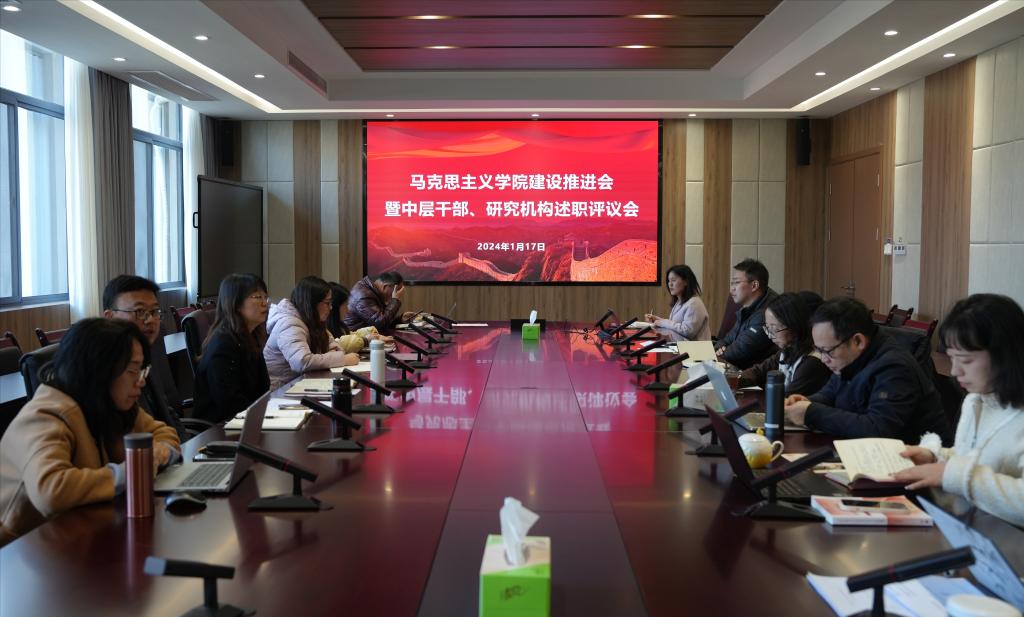 1月17日上午,马克思主义学院建设推进会暨中层干部、研究机构述职评议会议在6号楼研习中心召开。马克思主义学院党总支书记、院长邹宏秋,副院长王志强、综合办主任、各教研室主任、各研究机构负责人以及青年博士参会。会议由邹宏秋主持。
