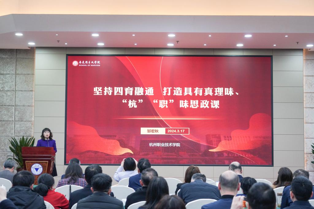 会上,邹宏秋以《坚持四育融通 打造具有真理味、“杭”“职”味思政课》为题作思政课改革创新工作经验交流发言。面向全省高校马克思主义学院负责人及马克思主义理论学科领域内众多专家学者,她首先阐明,高职教育作为高等教育的“半壁江山”,建好思政课、上好思政课责任重大。关于如何建好、上好高职思政课,她提出,要构建课堂育人、实践育人、网络育人、文化育人的“四育融通”育人模式,以实现协同育人,增强思政课教学真理味道、职业特色和学生体验感,推动思政教育与职业教育深度融合、同频共振,并详细介绍了学校在做实“四育”、实现“融通”方面的主要举措和取得的突出成效,充分展示了学校在马克思主义学院和思政课建设方面的经验做法和丰硕成果。