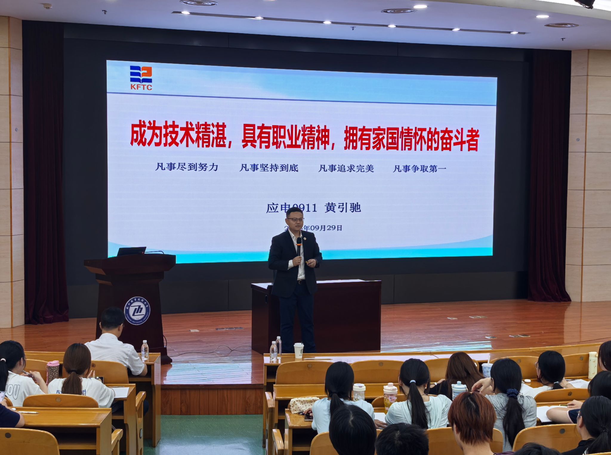9月29日下午,马克思主义学院邀请学校2009级应用电子技术专业校友、宁波江丰电子材料股份有限公司党委副书记黄引驰重返母校,在行政楼报告厅为大一新生上思政课。学校部分思政教师、大一学生400余人参加活动。活动由马克思主义学院副院长王志强主持。